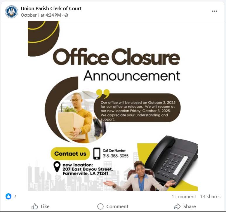 On October 1st, the Union Parish Clerk of Court